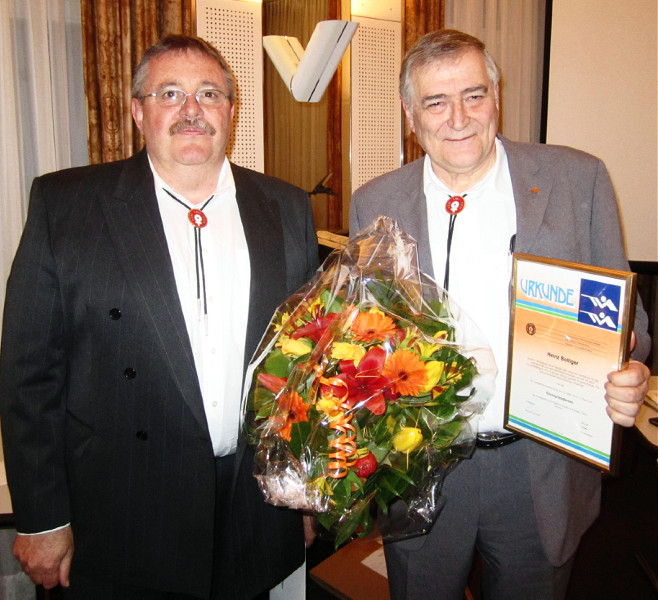 Marcel Ochsner (links) gratuliert Heinz Bolliger zur Ernennung als Ehrenpräsident und übernimmt von ihm die SMV-Verbandsführung.